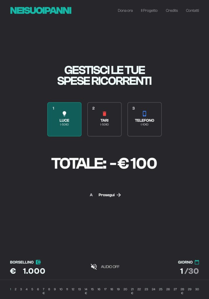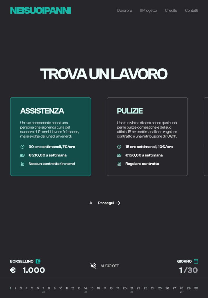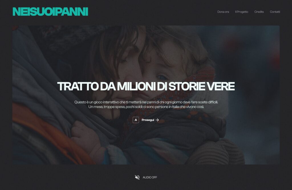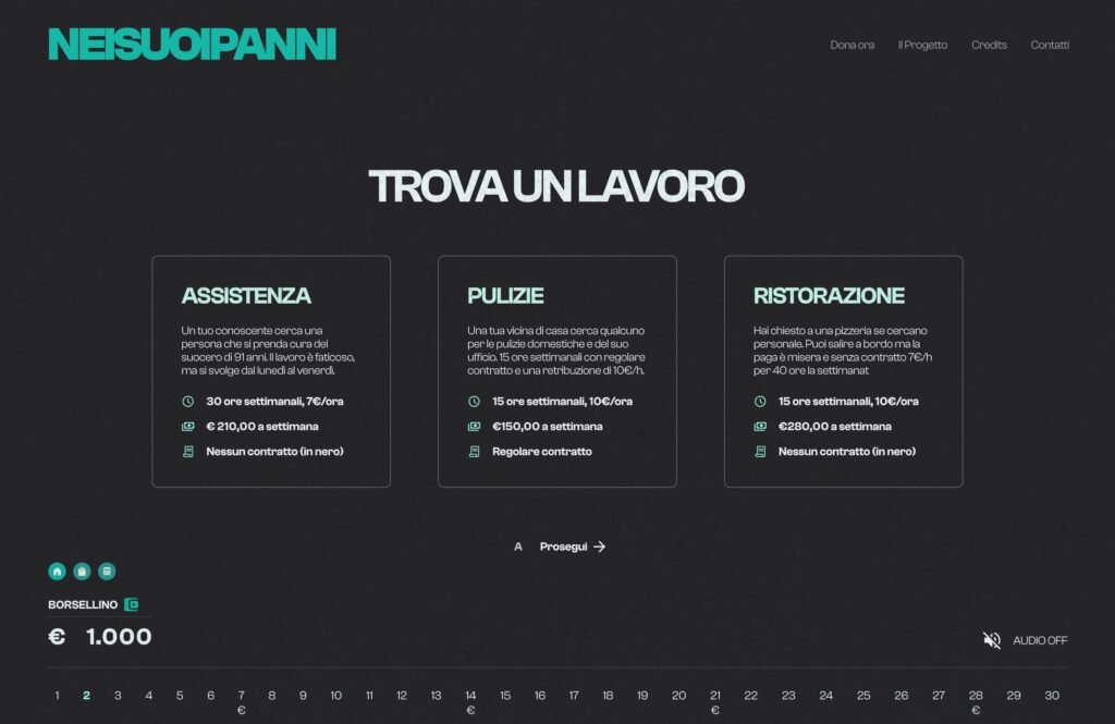 “NEISUOIPANNI” (translated in “in someone else’s place“) is a browser-based life simulation game created in collaboration with a non-profit organization that supports vulnerable communities through social projects such as clothing drives and local assistance programs.
