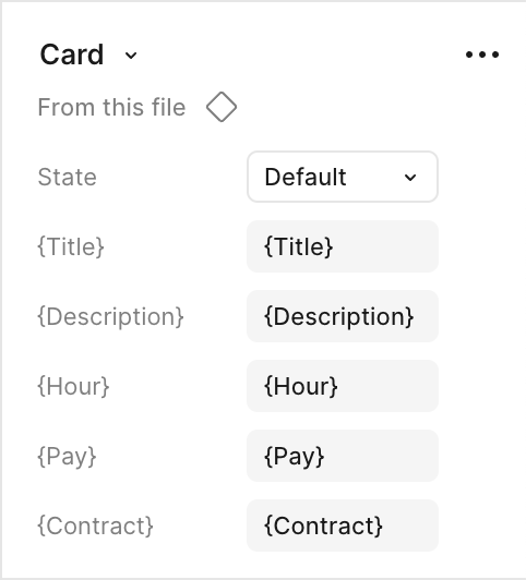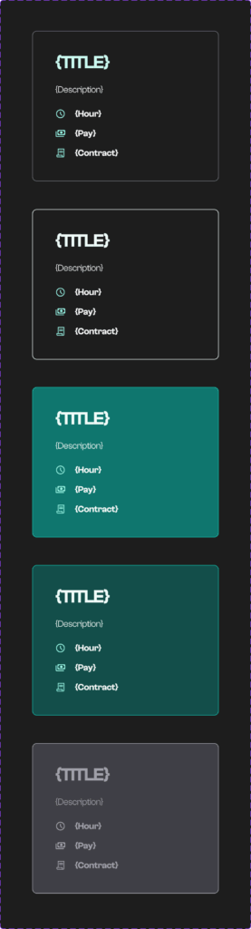 Card templates: Reusable for job offers, event outcomes, and narrative situations. Each includes dynamic slots for title, description, working hours, pay, and contract type, allowing full narrative flexibility with minimal design overhead.