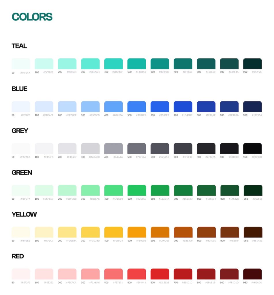 Each color group is structured across 10 steps (from 50 to 950), ensuring flexibility for shadows, highlights, states, and background layering.