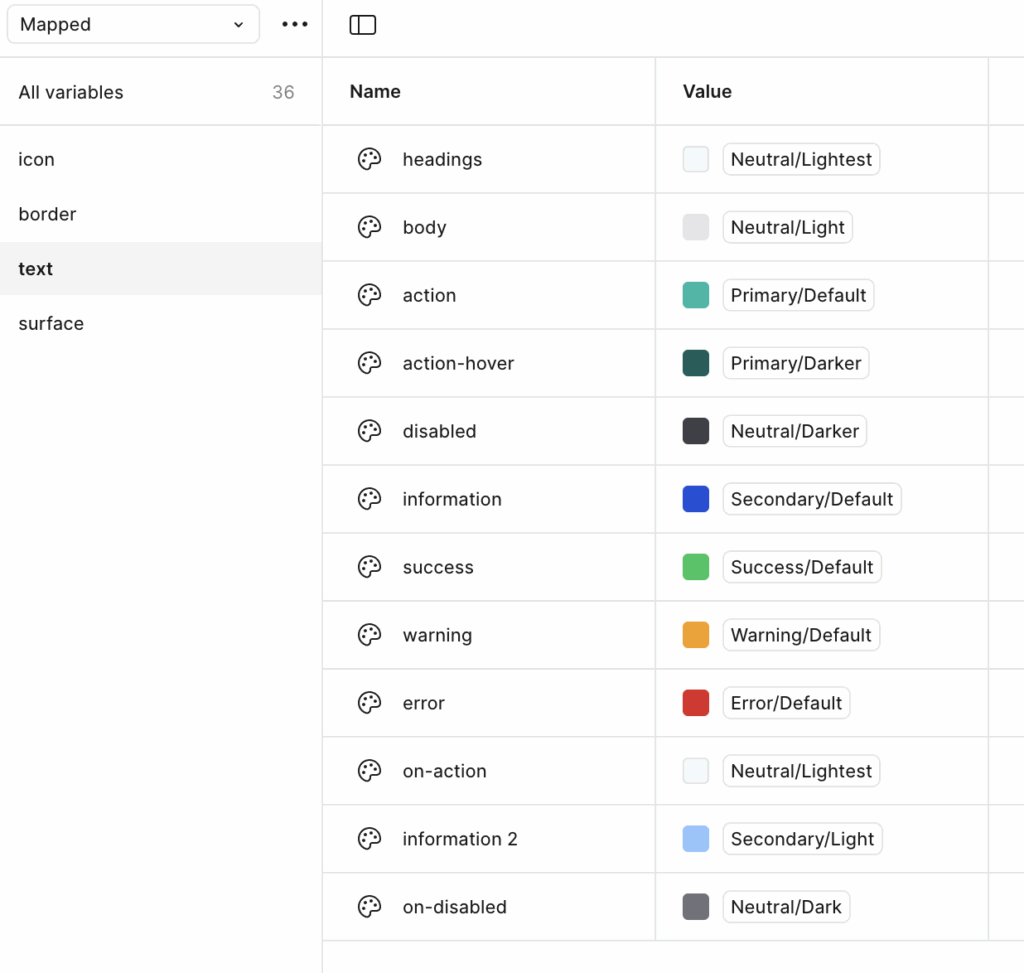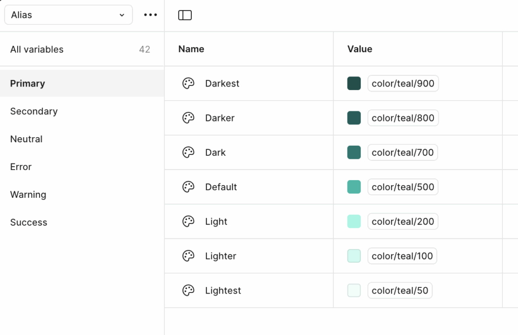 Color variables: Categorized into Primary, Secondary, Neutral, Error, Warning, Success, and more—each ranging from Lightest