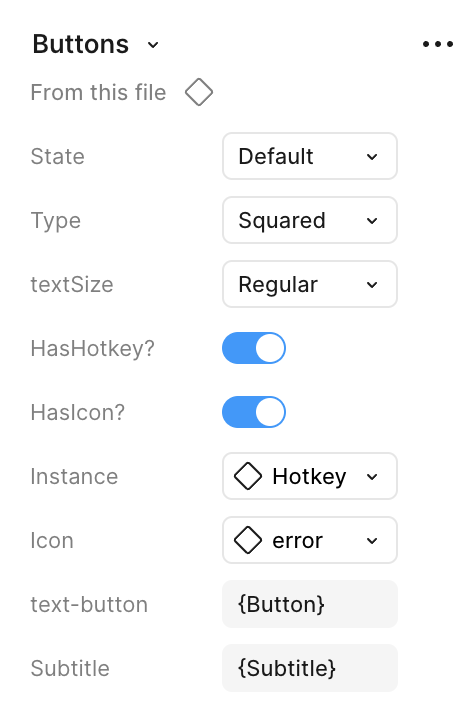 ), optional hotkey or icon support, text sizing, and shape customization (e.g., squared, rounded). States are mapped through tokens to semantic colors (e.g., Primary/Default